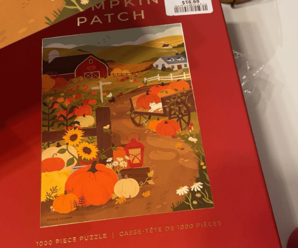 The challenging thing with this puzzle is not only are there a thousand pieces but most of them look alike. The picture has several pumpkins, so sometimes it’s hard to tell which piece belongs to which pumpkin lol.